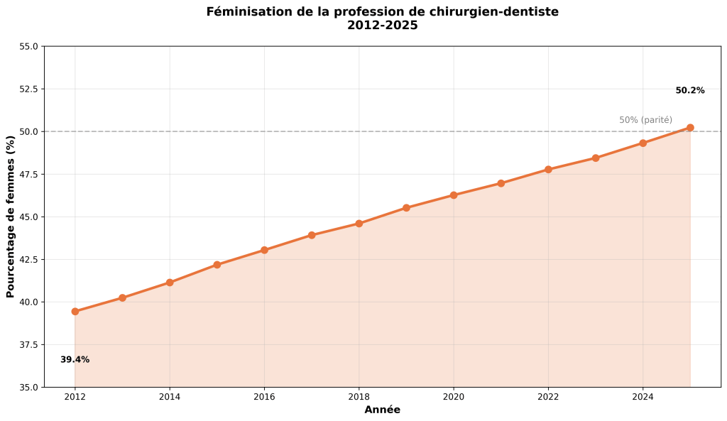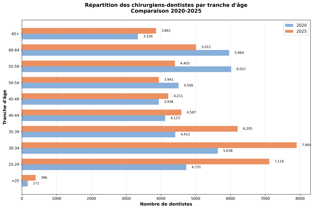 La France compte aujourd’hui plus de 49 000 chirurgiens-dentistes en exercice (source ONCD), soit une progression d’environ +18 % depuis 2012. Cette croissance est réelle et durable. Elle reflète les décisions de formation prises dans les années passées (relèvement progressif du numerus clausus, ouverture européenne des parcours, et augmentation différée du nombre de diplômés). La démographie actuelle n’est donc pas le résultat d’une adaptation récente, mais l’effet mécanique de choix structurels dont les conséquences se matérialisent aujourd’hui.