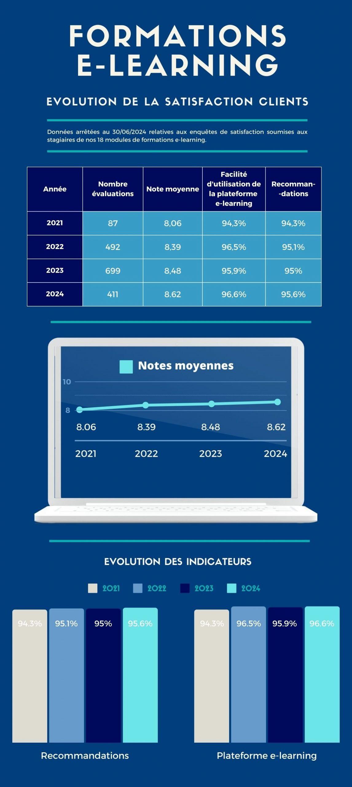 Voici la synthèse des évaluations pour les formations en présentiels et les formations en e-learning.