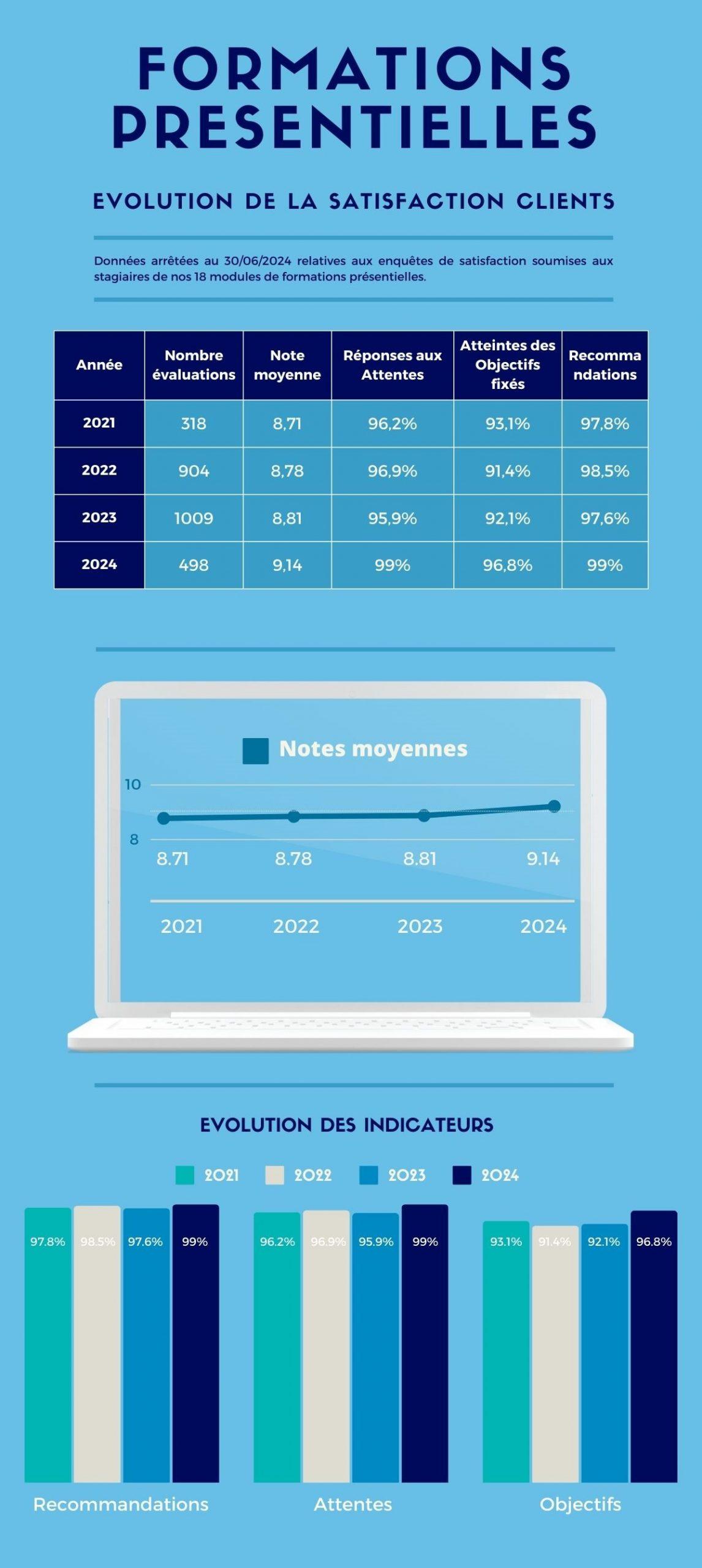 Des enquêtes de satisfaction sont envoyées à nos stagiaires à l’issue de chaque session de formation.