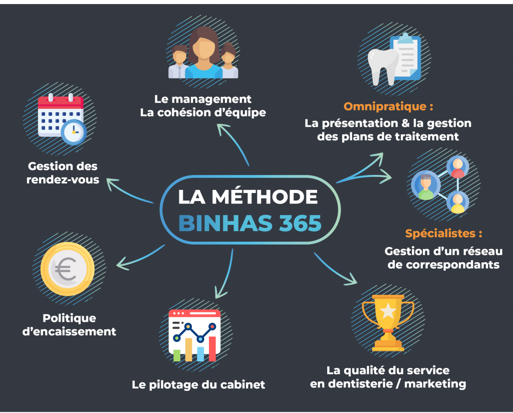 Les problématiques liées aux cabinets d’orthodontie sont complexes et s’entremêlent souvent. En effet, il se peut qu’un problème de temps soit en réalité lié à un manque de cohésion d’équipe ou de protocoles clairs…Il se peut que certains problèmes d’encaissements soient la conséquence d’un circuit patient non optimisé…De ce fait, à la Binhas Global Dental School, nous envisageons une série de systèmes organisationnels tous interdépendants et imbriqués. C’est ce qui nous a permis, lors de notre accompagnement auprès de plus de 800 cabinets d’orthodontie, d’apporter des solutions concrètes aux problématiques de management et d’organisation.