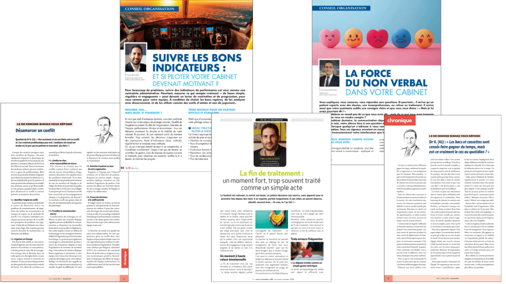 Présente dans les principales publications professionnelles du monde dentaire, la Binhas Global Dental School partage chaque mois son expertise en management, organisation, gestion et communication à travers des chroniques publiées dans la presse spécialisée.